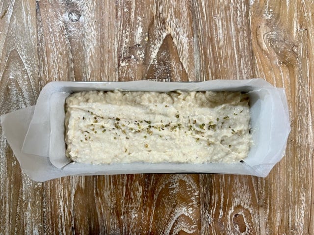 ② クッキングシートを敷いたパウンド型に①を入れて、表面を平らにしてドライハーブを振り、予熱が完了したオーブンに入れて、40分焼成します。