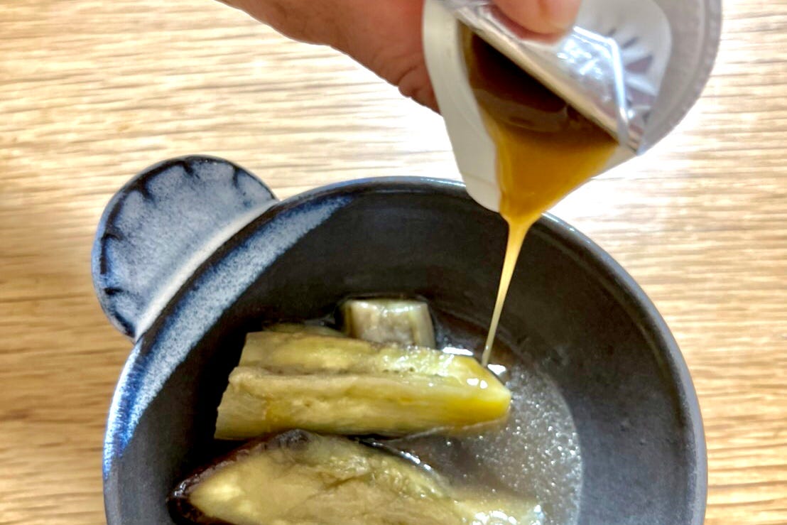 同商品で作ったなすの煮浸しも、超簡単にできました。顆粒出汁のように溶かす手間もなく、しかも自分でつくったとは思えないくらいにしみしみでおいしい!