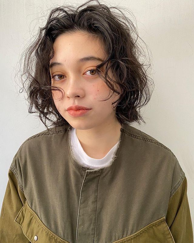 外国人風くるくるパーマの前髪なし黒髪ボブ