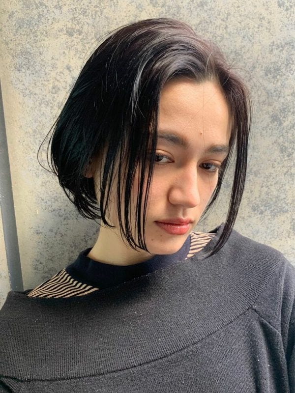 2段にくっきりと分かれるようにカットした少し個性的なヘアスタイルで、少しのモード感をプラスしたい時におすすめです。