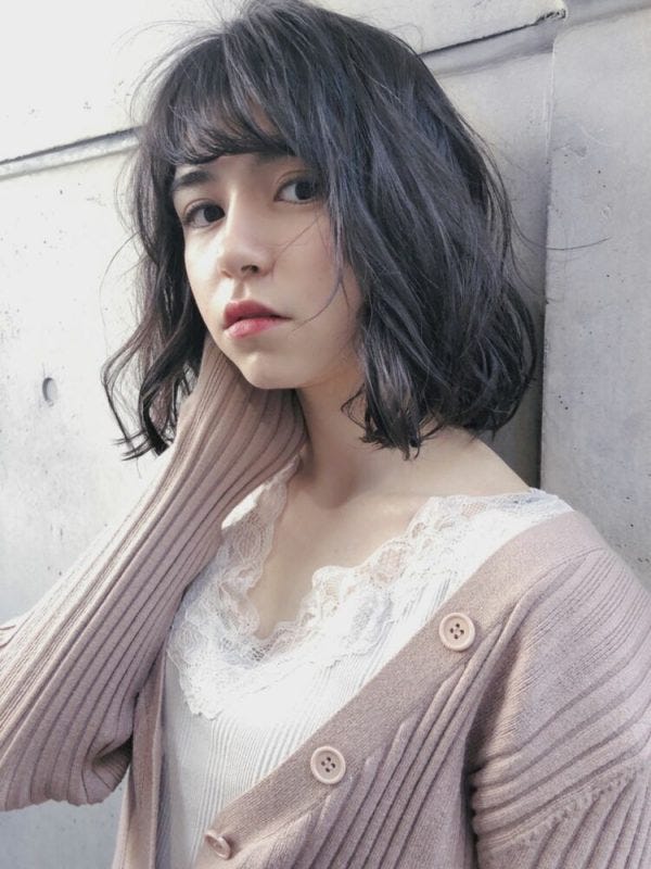 前髪なしの黒髪ボブは、ラフな波ウェーブでふんわりさせるとグッと大人っぽく女性らしさが出て、おしゃれに垢抜けます。