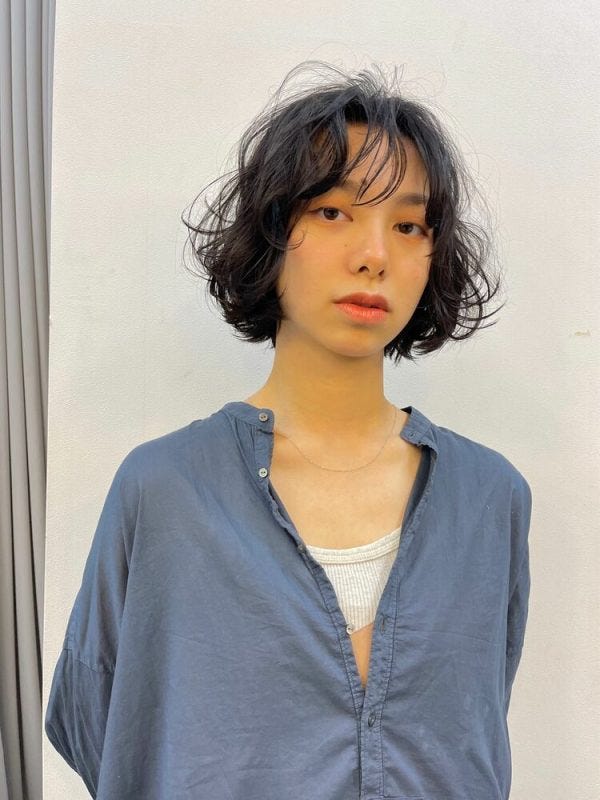 レイヤーとパーマで軽やかな前髪なし黒髪ボブ