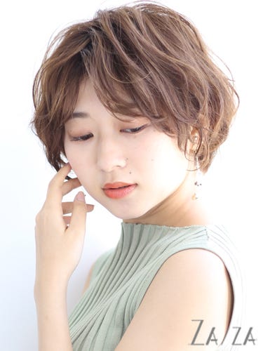 ふんわりと横にボリュームがあるショートは、パーマをかけることで暗髪かつボリュームがある髪型でも軽やかな印象となります。