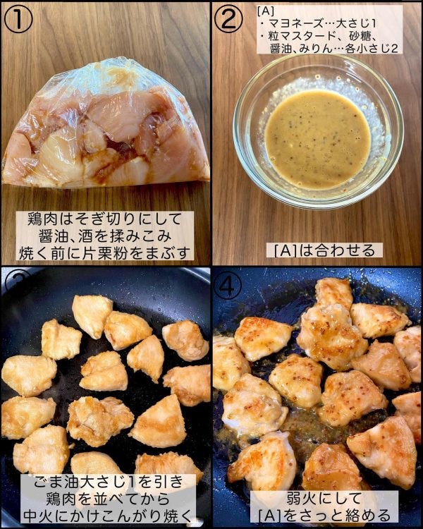 マスタードと醤油とマヨネーズの組み合わせが鶏肉をとっても美味しく食べさせてくれます。