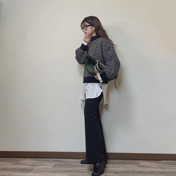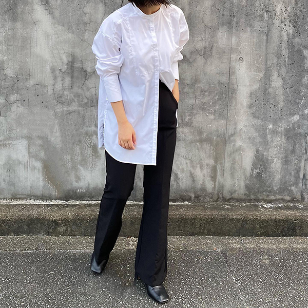 ハリ感のある素材が使われていることで、フレアのデザインがより際立ち、きれいめスタイルにもぴったりです。