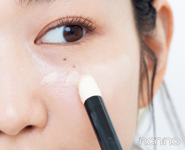 「そばかすは広範囲にあることが多いので、カバー力高めのクリームタイプのコンシーラーを気になる部分に点置きしたら、密度の高いブラシでくるくるぼかすように広げてみて。ニキビ跡やシミよりも色が薄いので、ヴェールをかけるイメージで薄膜に仕上げるのがポイントです」