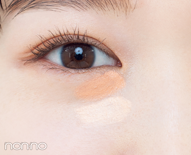 「目の下の皮膚は乾燥しやすい上に、動きの多いパーツ。密着力の高い練りタイプを、2色使いするのがおすすめです。目頭下から黒目の内側までオレンジをのせ、その下に並行して肌色に合うベージュをオン。指で軽くたたくように2色をなじませて。範囲を広げすぎないのもカギ」