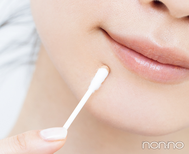 「凹凸のあるニキビには、クリーミーで肌に柔軟に沿うテクスチャーのコンシーラーを選んで。あまりグリグリ触ると刺激を与えてしまうので、清潔な指でそっとなじませるのがコツ。ニキビを覆うようにコンシーラーをのせた後、輪郭をぼかし、中心部にさらに重ねれば完成」