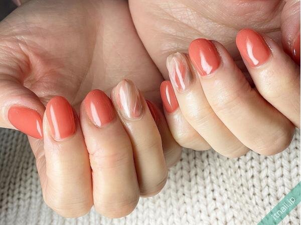 女性らしさに溢れたコーラルオレンジネイルに、抜け感をプラスするのもオシャレ。シンプルにまとめあげるのではなく、あえて外したバランス感が上級者な印象を強めてくれます。ニュアンスネイルのポイントアートが、アンニュイな空気感を漂わせていますね。