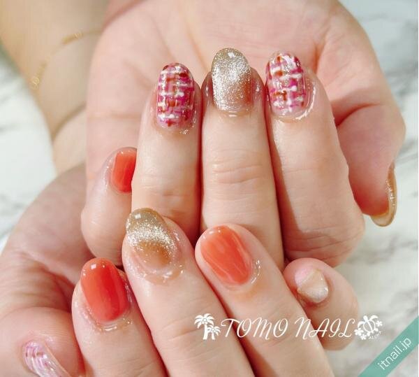 続いてご紹介するのは、艶のあるコーラルオレンジがみずみずしく映える、キュートなMIXネイルです。マグネットアートでスタイリッシュな質感を添えたら、ざっくり描いたツイード柄であたたかみを演出して。さりげないアシンメトリースタイルもポイントです。