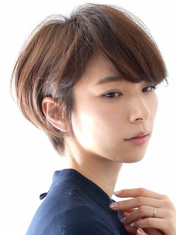 前髪なしのショートボブをサイドで分けて流し前髪のように仕上げることで顔を小さく見せて丸顔さんが気になる頬の丸みも軽減してくれますよ。