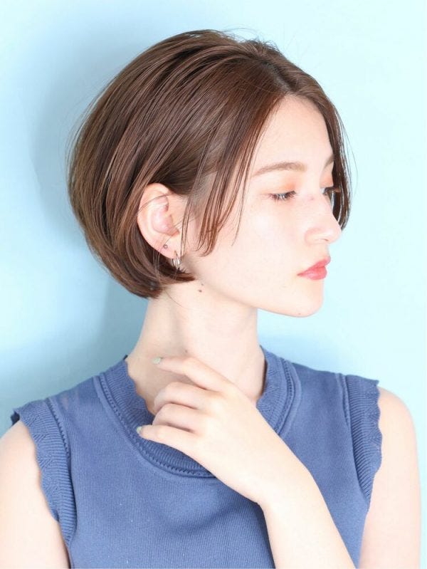 丸顔さんの顔型カバーにも使える前髪なしのショートボブは、きちんとした印象が強いので少し明るめでも派手になりませんよ。