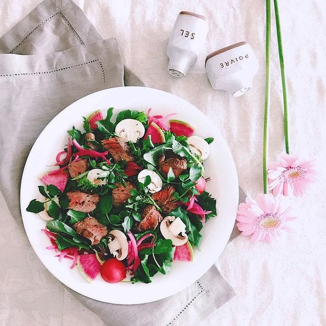 牛肉の赤身に合わせて赤玉ねぎや紅芯大根で色を添えた、おしゃれな出来栄えのサラダです。