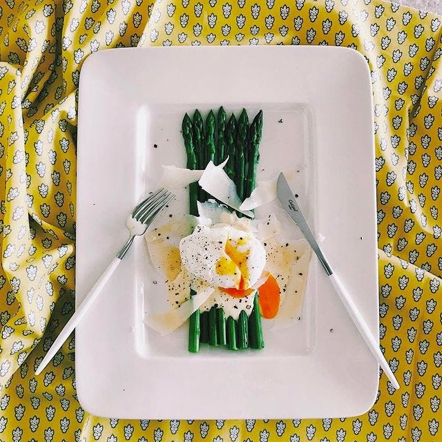 アスパラが主役なのでカットせずに長いまま茹でて、ポーチドエッグとオランデーズソース、粉チーズをかけましょう。
