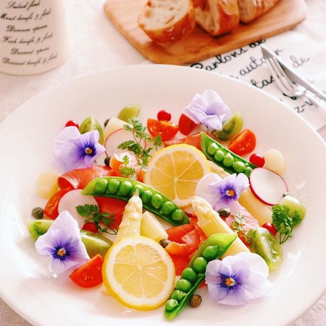 春野菜はサッと茹でて、おしゃれなお皿に盛り付けましょう。トマトやスモークサーモン、あればエディブルフラワーも添えるととっても華やかです。