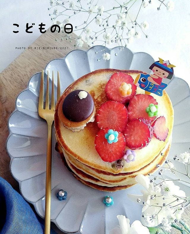 米粉パンケーキで何枚も重ねて作った、おしゃれなデザートはいかがでしょうか。盛り付けはイチゴやチョコなどを使って、鯉のぼり風に見立てています。