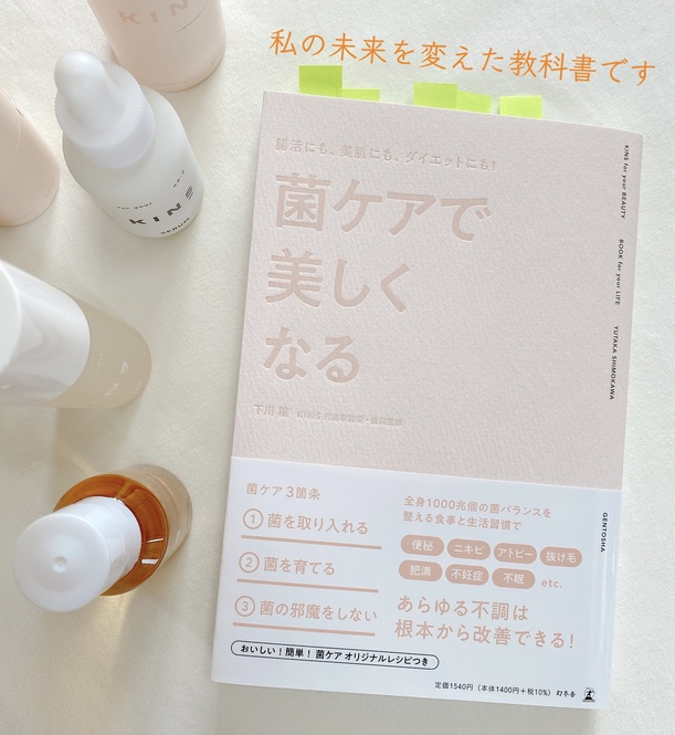 菌ケアをはじめるために、私が選んだのは菌ケアのサブスクを展開する「KINS(キンズ)」。美容好きなおしゃれさんの間でも大人気のブランドですよね。「KINS」の公式サイトや、株式会社KINS代表取締役・下川穣(しもかわ ゆたか)さんの著書『腸活にも、美肌にも、ダイエットにも!菌ケアで美しくなる』を参考にしながら、菌ケア食生活やスキンケアを実践しました。