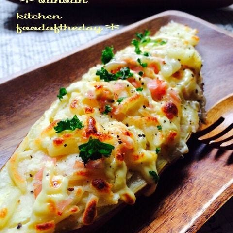 さつまいもの中身をくり抜き、皮を器にして焼くのがポイント。簡単ですがさつまいもの甘さとハムチーズの塩気が絶妙で、こどもも好きな味付けになっています。