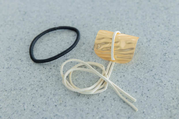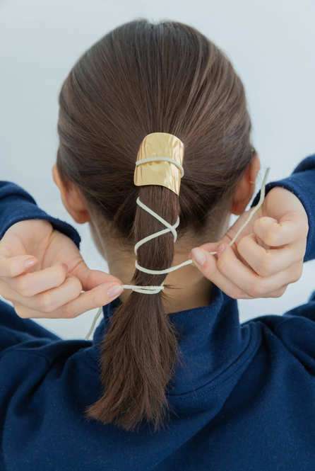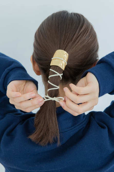 「ゴールド×レザー紐の組み合わせがオシャレで、アクセント使いにピッタリ! ヘアカフを挿し、紐を髪に巻き付けるだけでとっても簡単なので、忙しい朝に重宝すること間違いなし! 不器用さんにもオススメです」。