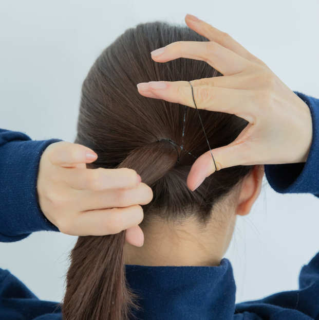 結び目にヘアカフを挿す。ゴムの内側にしっかり挿すことで、グラつかずに安定感がアップ!