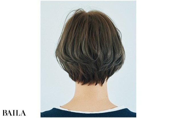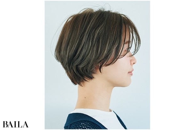 ストレートなハンサムショートが人気継続中。昨今のカジュアルなトレンド服とのバランスで、ちょこっと色気が欲しくなったならやや長めのショートボブでニュアンス出しを。前髪長め、襟足のウェイト低めの重めフォルムに設定し、はらりと目にかかる“うざバング”でアンニュイ印象に。さらにフォルムがやわらかく丸みを帯びるようなボディパーマをプラスすると、シャープになりすぎず、短めレングスでも華やかさを堪能できる。