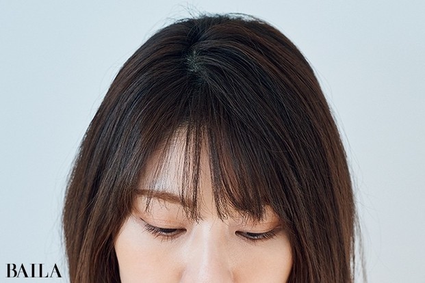 面長カバーといえば横幅前髪がセオリーだったけれど、幼く見えるため大人はトライしづらい。そこで新提案。三角前髪の頂点を深くつくり、まるでおでこが広いかのような錯覚を利用。すると目の下の長さが気になりにくくなる効果が。前髪に厚みがある分、透け感を足すのが大切。重めバングながら今っぽい雰囲気にも。