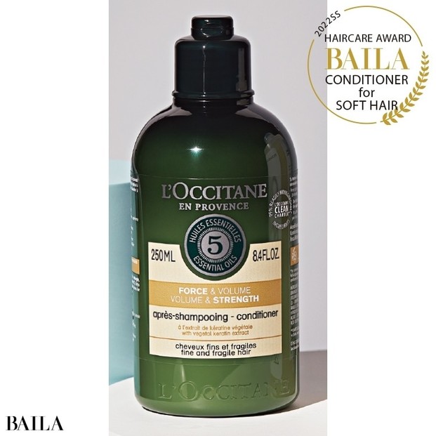 5つのハーブとベジタブルケラチンが、ハリ・コシ・ボリュームをサポート。「ナチュラルなハリとコシがぺたんとしがちな細髪を、しなやかに補強。引きで見た印象の生き生き感まで変わる!」(長田)。250㎖ ¥2860/ロクシタンジャポン