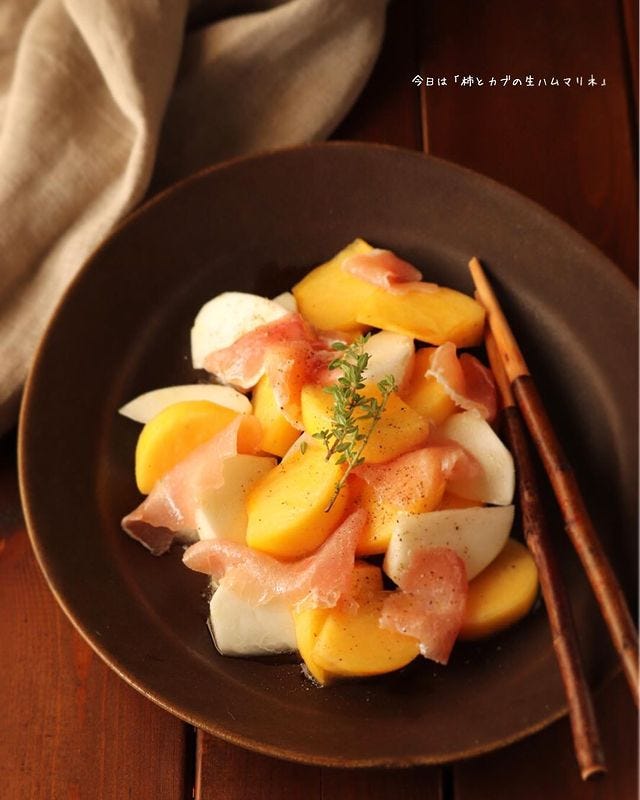 カブと果物の柿を使いますが、生ハムの塩気と柿の甘さが絶妙でカブや柿のシャキシャキとした食感も美味しいです。