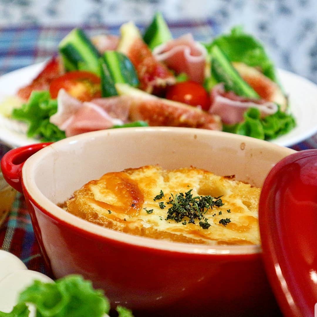 オニオングラタンスープはあめ色になるまで炒めた玉ねぎでスープを作り、パンとチーズをのせて焼いたスープです。