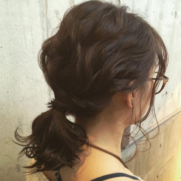 襟足の後れ毛を多めにとることで、あえてラフさを出したローポニーのヘアアレンジです。
