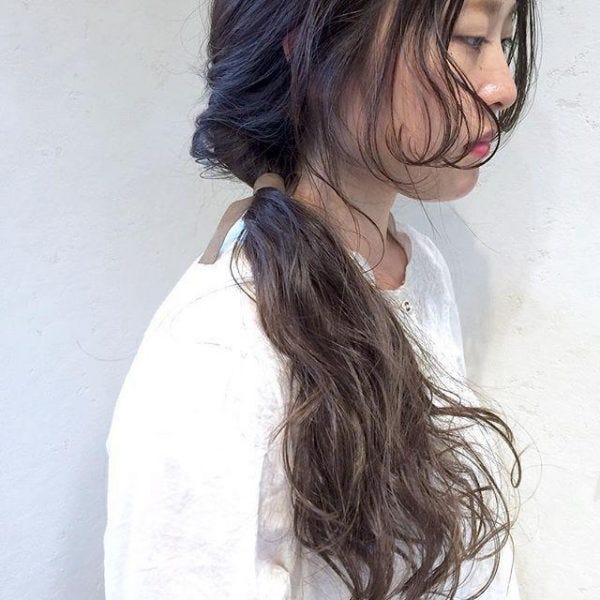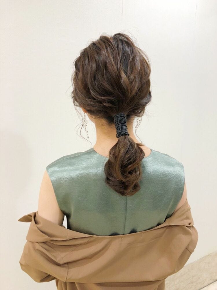 こちらのローポニーは、結ぶ前にランダムなウェーブを作っているのがおしゃれ見えのポイントです。