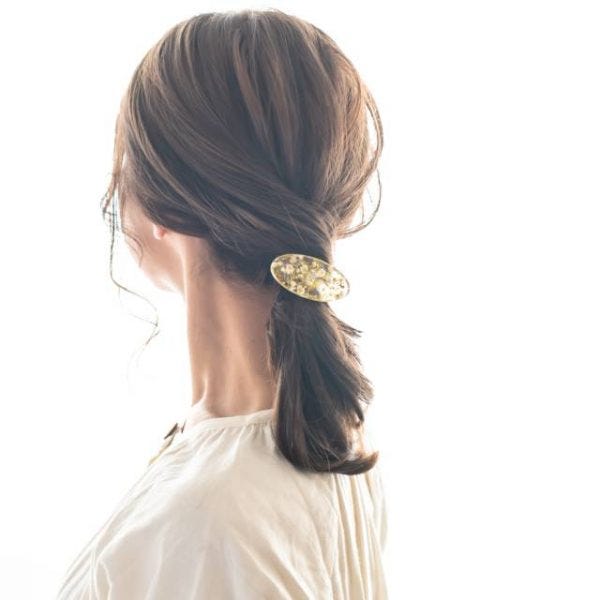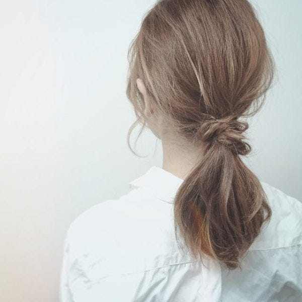 ざっくりとまとめて結んだミディアムヘアのローポニーですが、結び目に髪の毛を巻き付けてヘアゴムを見えないようにしているだけで、ぐっと垢抜け感が増していますね。