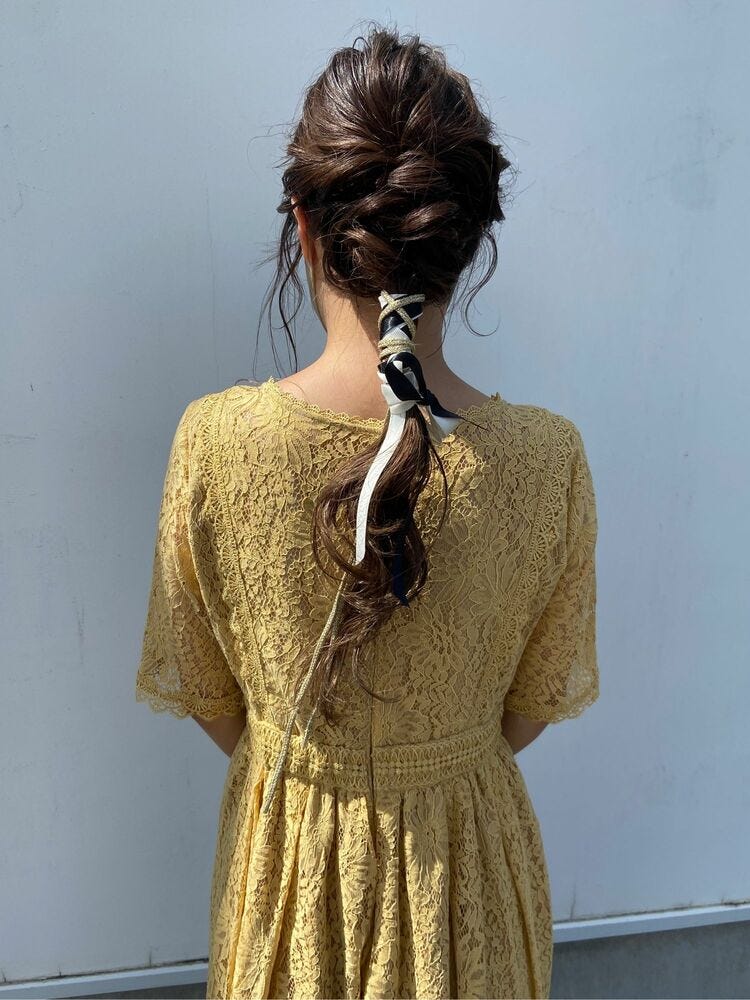 こちらのヘアアレンジでは、結び目に紐を巻き付けていることでトレンド感を出すことにも成功しています。