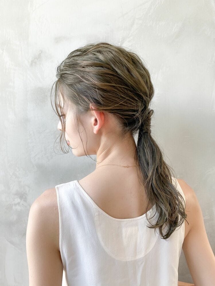 ヘアカラーも今年人気のくすみ色でカラーリングされているので、シンプルなローポニーにも今年らしさがたっぷり感じられるヘアアレンジになっていますね。