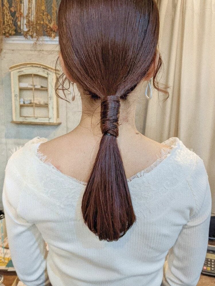 きちんと見せたいお仕事の場面や結婚式などのパーティシーンにピッタリなローポニーのヘアアレンジです。