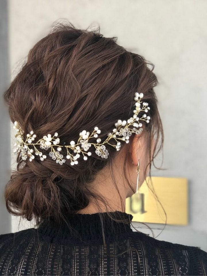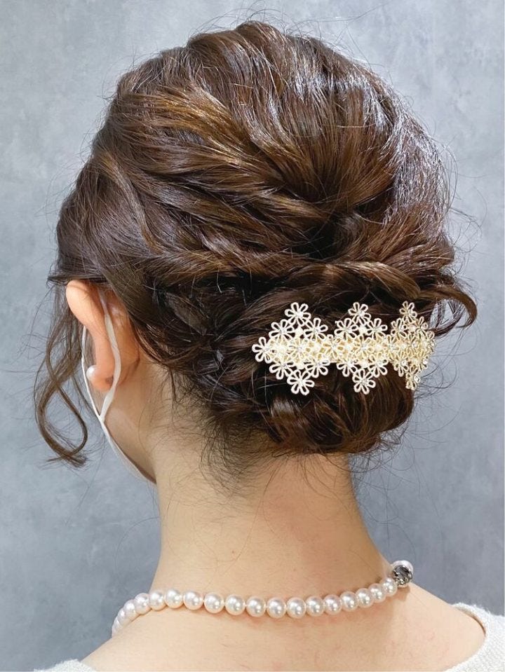こちらはサイドからねじってまとめたシニヨン風アレンジです。さりげないヘアアクセサリで華やかさをプラス。