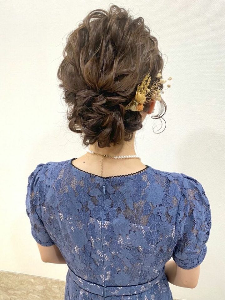 全体的にコテで巻いてからアレンジするかパーマがかかった髪で作るのがベター。簡単におしゃれな大人のお呼ばれヘアに見せられます。