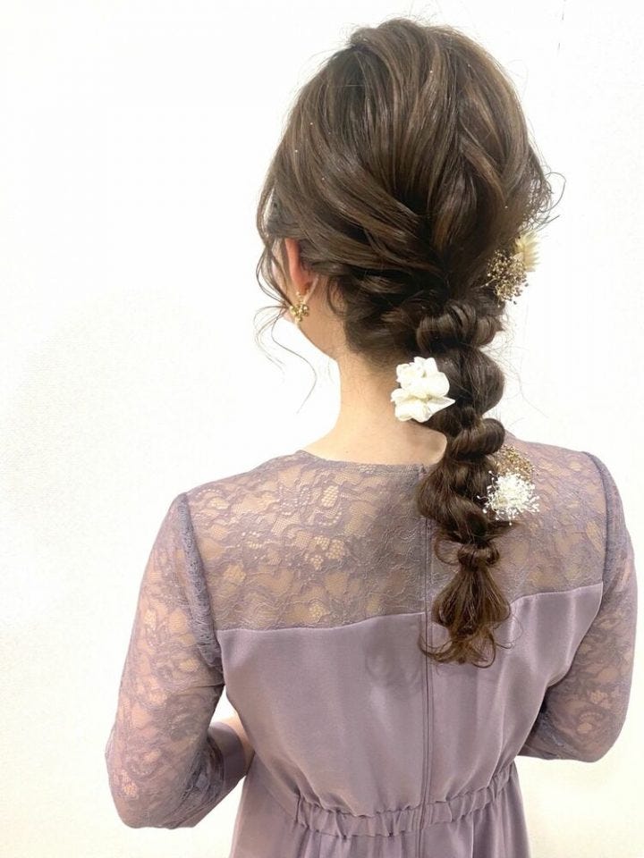 サイドはゆるくねじり編みにして、まとめているので崩れにくく二次会まである方におすすめできます。ミディアムやセミロングでも楽しめるセットです。