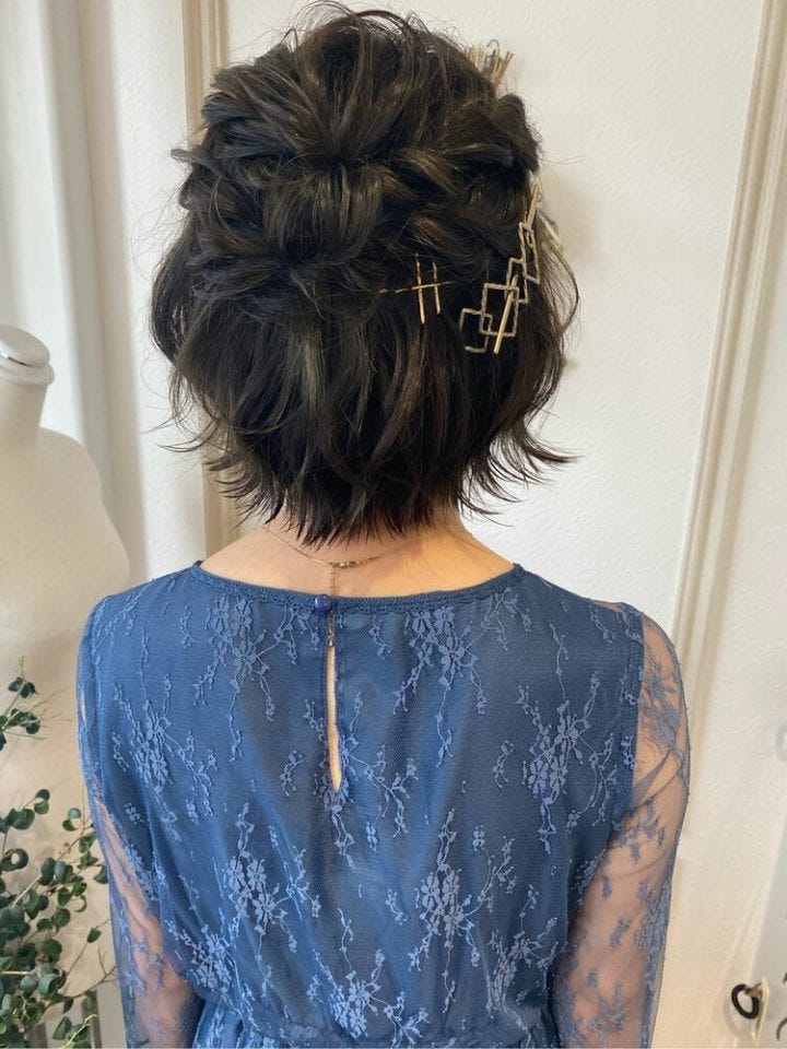 ショートボブをハーフアップにして、ゴールドのヘアピンをアクセントにしたお呼ばれヘアです。
