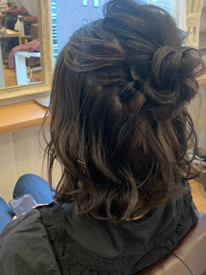 セミロングの長さなら、ハーフアップのアレンジも可愛くまとめられます。ウェービーパーマヘアのサイドの髪をねじり編みにしてまとめます。
