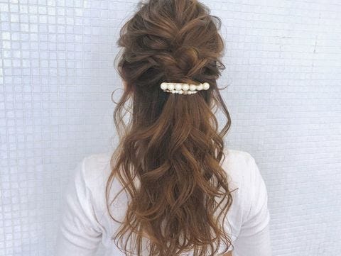 こちらは三つ編みと表編みを使った簡単ヘアアレンジで、パールのヘアアクセサリーをつけることで華やかさが増しておしゃれな仕上がりになりますね。