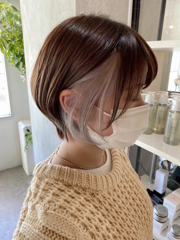こちらはダークブラウンにアッシュベージュのインナーカラーを合わせたショートヘアです。