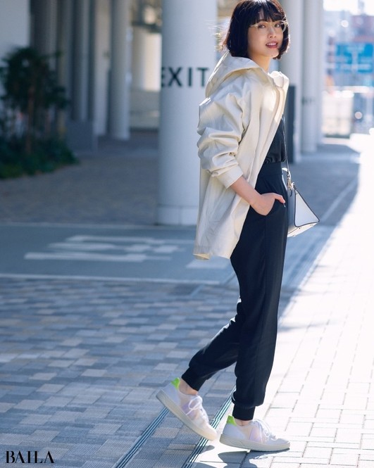 サステナブルなものづくりや高いデザイン性でおしゃれプロからの支持も厚い「ヴェジャ」。トレンドのジョガーパンツ合わせで、靴全体の色使いを隠さず披露して。靴¥26620/シードコーポレーション(ヴェジャ) ジャケット¥62700/デサント トウキョウ(リ:デサントシード) ニット¥35200/カオス丸の内(カオス) パンツ¥19800/トゥモローランド(ボールジィ) メガネ¥37400/アイヴァン 東京ギャラリー(アイヴァン) バッグ¥45100/ショールーム セッション(オーエーディー ニューヨーク)