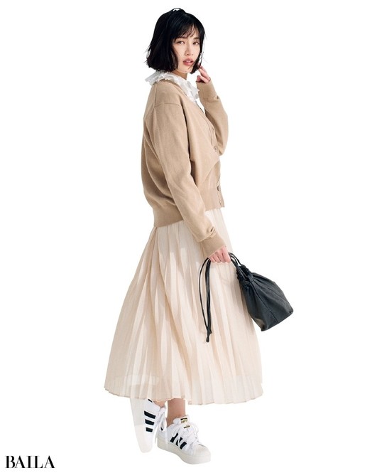「スーパースター」のスリーストライプスをふくらんだ刺しゅうで表現。厚底のボリューミーなフォルムが、風をはらむプリーツスカートと好バランス。靴¥15400/エービーシー・マート(アディダス) カーディガン¥28600/ロンハーマン ブラウス¥22000/ウィム ガゼット ルミネ新宿店(ウィム ガゼット) スカート¥26400/トゥモローランド(ボールジィ) バッグ¥40700/ショールーム セッション(モダン ウィーヴィング)