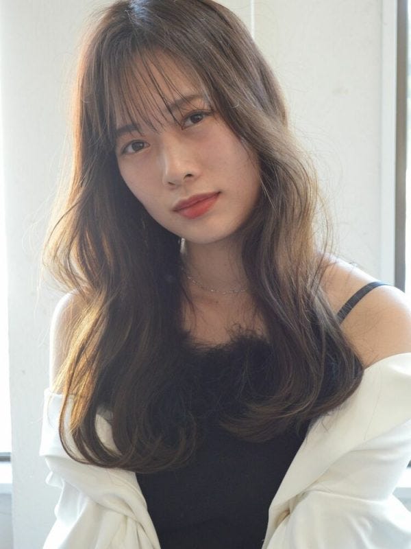 暗髪かつ重めの前髪のロングスタイルにすると重くなってしまいそうですが、ふんわりとゆるふわ感がある動きをつけることで重さが気にならなくなります。