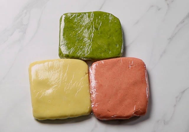 3色とも同じようにのばします。 のばし終えたら冷蔵庫(または冷凍庫)で型抜きがしやすい硬さになるまで生地を冷やします。