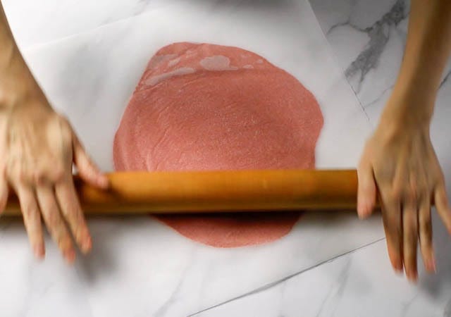 ⑤ 大きめのキッチンペーパー2枚を用意し、そのあいだに生地を置いてめん棒で叩きながら2mmくらいの厚さにのばします。