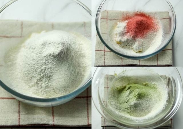 色をつけるのに今回は、緑色は抹茶、ピンク色はストロベリーパウダーを使ったので色ごとに違う味が楽しめます。