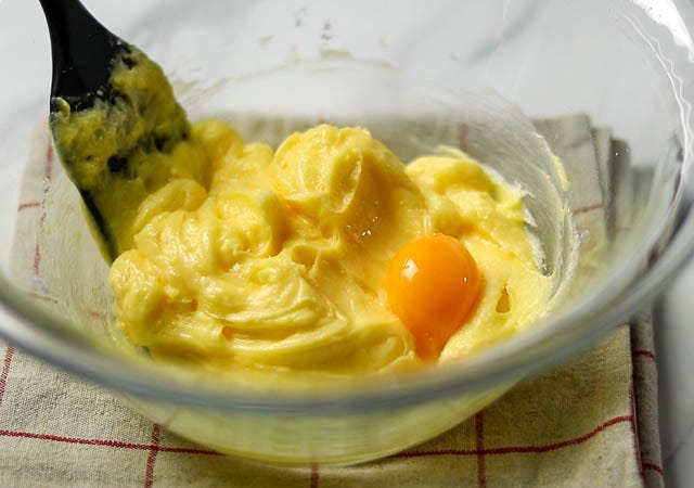 ② 卵黄をひとつずつ加え、その都度よく混ぜ合わせます。
