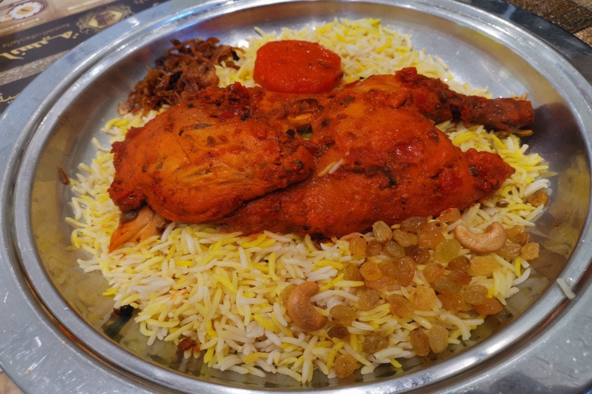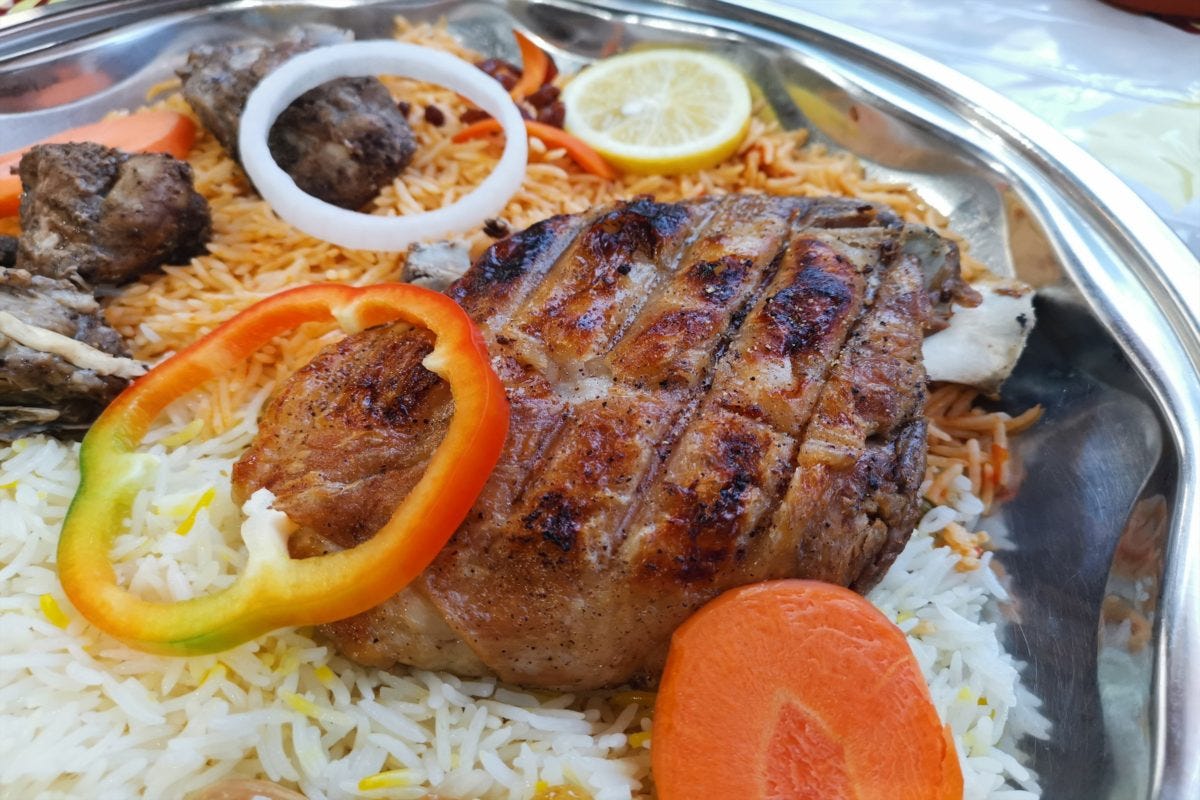 たとえばこちらの「マンディ」は、イエメン発祥の炊き込みご飯で、バスマティライスの上にしっとりと焼かれたチキンなどの肉が乗っている。